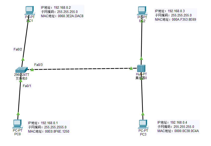 💡 进阶思考:为什么 PC2 和 PC3 都在 Fa0/3 接口? 因为 PC2 和 PC3 是通过**集线器(Hub)**连接到交换机的 Fa0/3 接口的。集线器属于物理层设备,对交换机来说是透明的。这就证明了交换机的一个端口可以学习并绑定多个 MAC 地址。