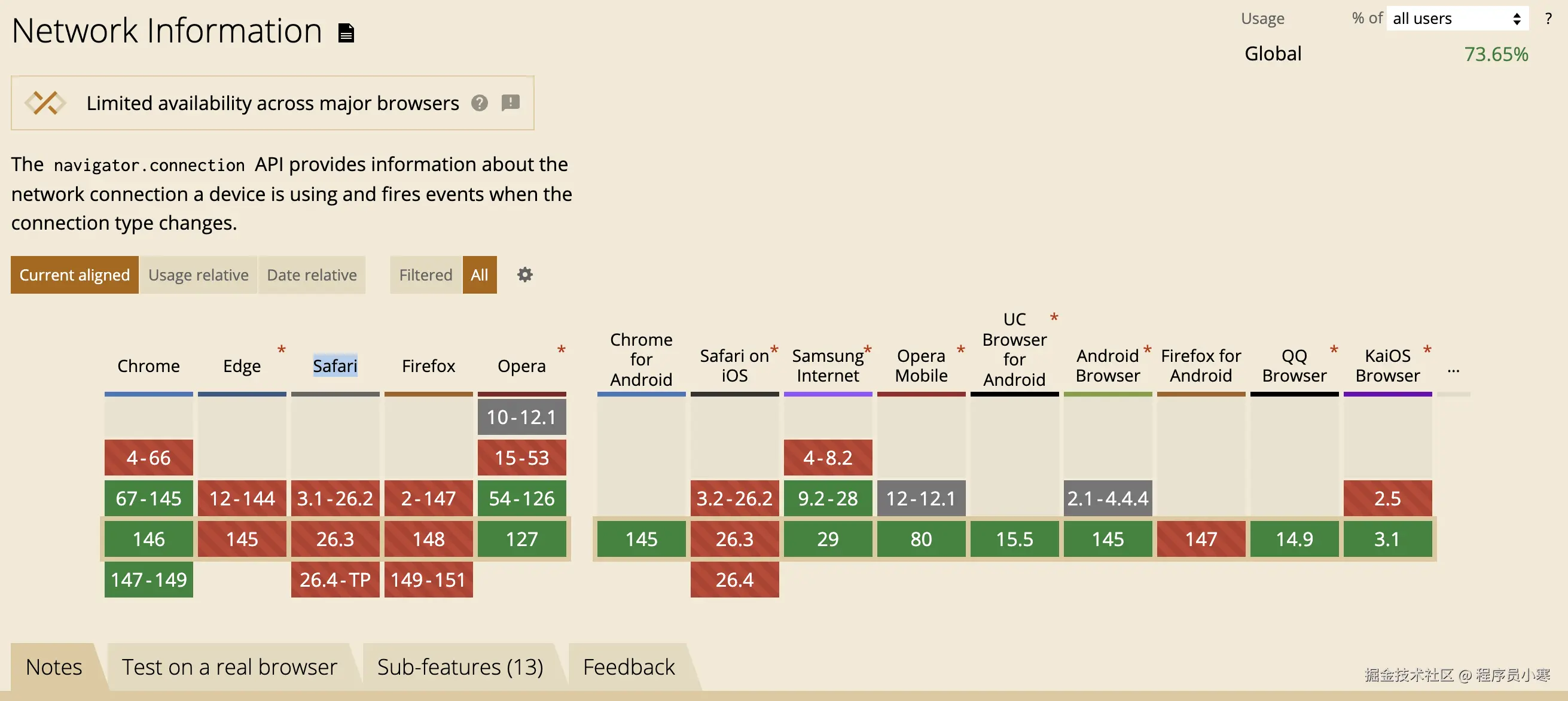 但 navigator.connection 存在两个问题,第一个是兼容性很差 ,像 Edge、Firefox、Safari 这种主流浏览器都不支持。