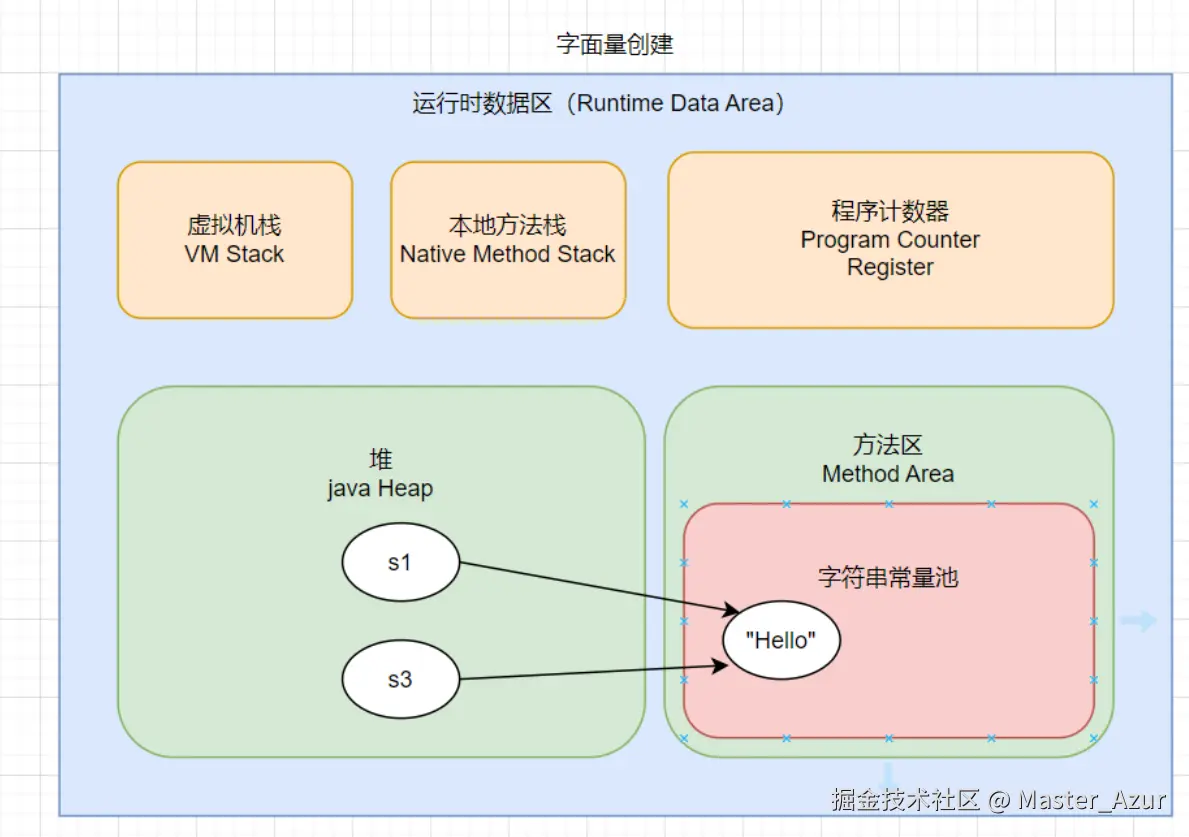 而对于字面量创建,当你使用字符串字面量创建字符串时,例如 String s = "hello";,这个字符串实际上是存储在字符串常量池中的。字符串常量池是方法区内的一块内存区域,通常与类的其他信息一起存储。这种方式创建的字符串会检查字符串常量池中是否存在相同的字符串字面量,如果存在,则返回那个字符串的引用;否则,会在常量池中创建一个新的字符串。