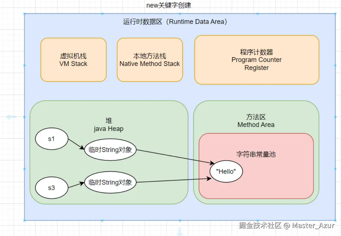 实际上使用new关键字的字符串的内容也是存放在常量池中的,当使用 new String("hello") 创建字符串时,尽管字符串字面量 "hello" 存储在字符串常量池中,但 new 关键字会导致在堆上创建一个新的 String 对象。这个对象包含一个指向常量池中 "hello" 的引用。这种方式不会检查字符串常量池中是否已经存在相同的字符串,总是会在堆上创建一个新的对象。