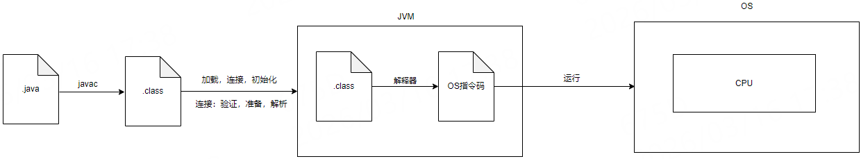 Java源代码最终想要执行,仅仅通过javac编译为字节码是不够的,因为程序最终执行是在底层的操作系统执行的,而,底层操作系统是不能识别和执行class文件的字节码的,所以还需要进一步的将字节码编译为机器码,默认JVM在运行过程中会通过解析器interpreter来完成这个工作,如下图: