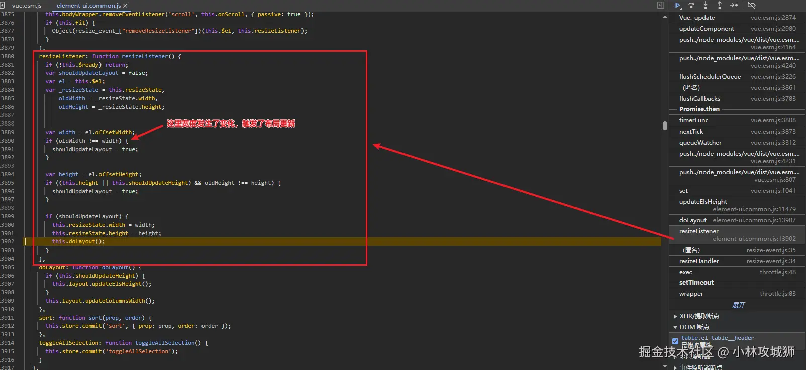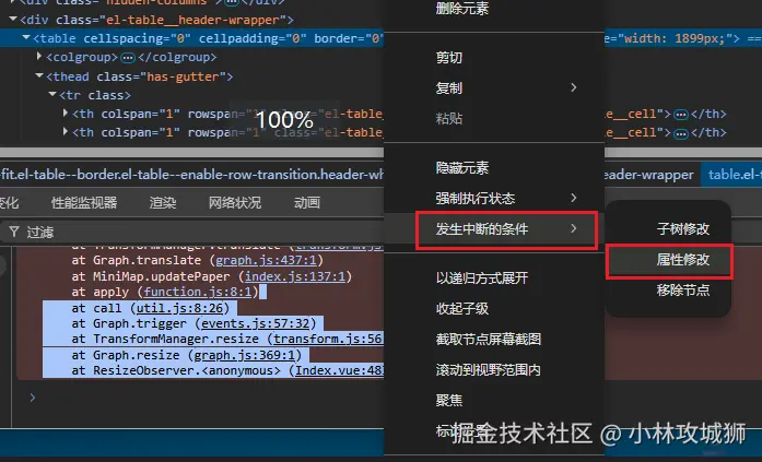 - 通过观察表格的元素,可以看到表格的宽度发生了变化,为了进一步定位触发宽度改变的代码位置,采用 dom 属性断点来观察代码执行