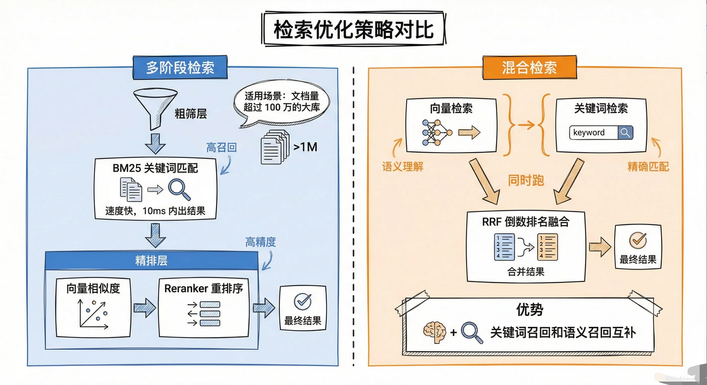 单纯靠向量检索其实不够用,生产环境通常会做多路召回,混合检索 特别适合那种用户可能用专业术语搜索的场景,纯向量检索容易漏掉精确匹配的结果。