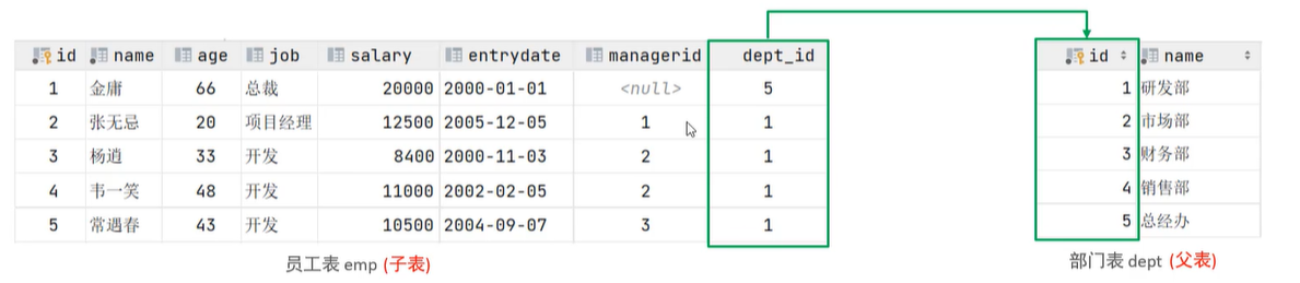 注意:目前上述的两张表,在数据库层面,并未建立外键关联,所以无法保证数据的一致性和完整性的。
