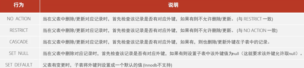 CONSTRANT\] \[外键名称\] FOREIGN KEY (外键字段名)REFERENCES 主表 (主表列名) ); ALTER TABLE 表名 ADD CONSTRANT 外键名称 FOREIGN KEY (外键字段名) REFERENCES主表(主编列名); 删除外键 ALTER TABLE 表名 DROP FOREIGN KEY 外键名称; 删除/更新行为:  ALTER TABLE 表名 ADD CONXTRAINT 外键名称 FOREIGN KEY (外键字段)REFERENCES 主表名(主表字段名) ON UPDATE CASCADE ON DELETE CASCADE;