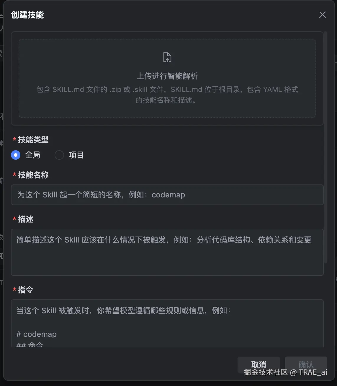 若你需要使用外部已创建的技能,可以直接将 SKILL.md 文件或包含 SKILL.md 以及其他相关文件的 .zip 文件导入至 TRAE。