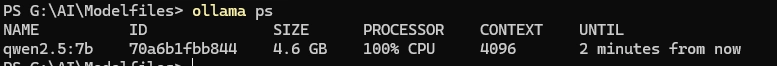 SIZE: 占用内存大小PROCESSOR:100% CPU: 表示模型完全在中央处理器 上运行,没有使用显卡(GPU)加速。我的显卡的显存只有4GB。CONTEXT:上下文窗口大小。当前会话保留的"记忆"长度(Token 数量)。这个数字越大,占用的内存也越大。UNTIL(自动卸载倒计时):表示如果接下来没有任何人使用该模型,Ollama 将在 2 分钟后 自动把它从内存中卸载,以释放资源。