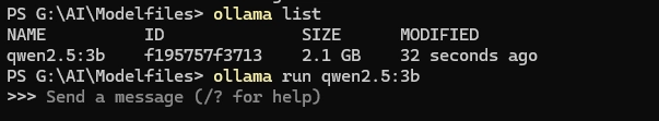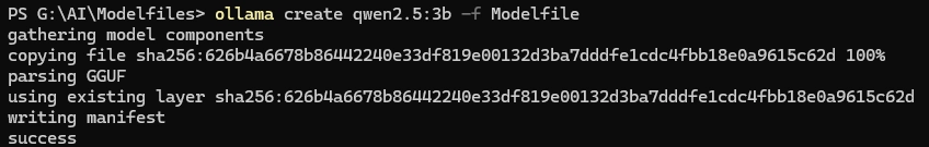 ollama create qwen2.5:3b -f G:\AI\Modelfiles\qwen2.5-3b\Modelfile