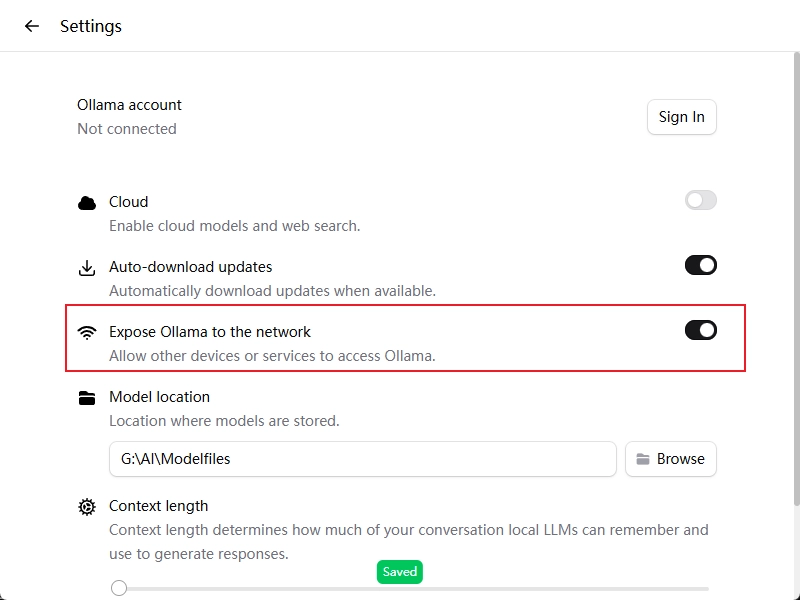 默认 Ollama 只接受本机连接,拒绝局域网 IP(192.168.x.x),需要让 Ollama 暴露在网络上,Windows环境下按照下图配置即可。