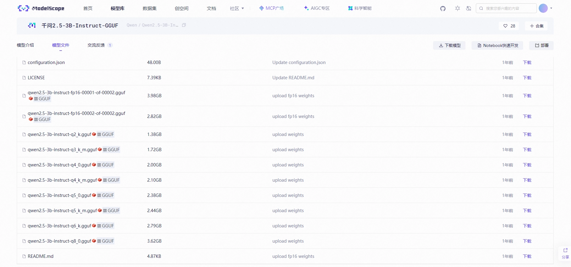 通过modelscope来进行浏览器下载模型,用Qwen2.5-3B-Instruct-GGUF演示(实际上我部署的就是这个)。