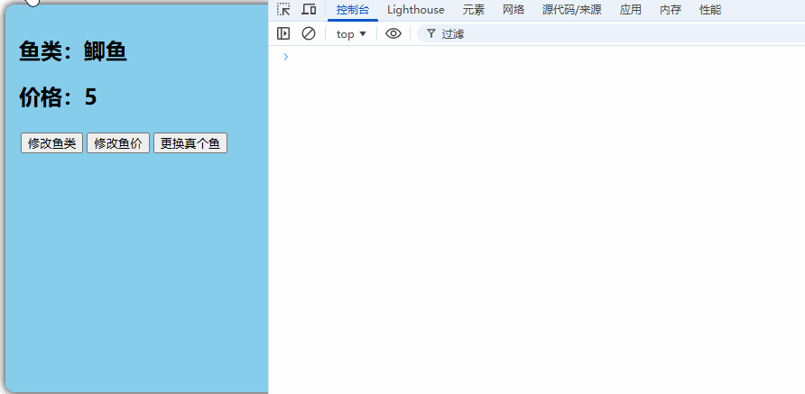 <button @click="changeName()">修改鱼类</button> <button @click="changePrice()">修改鱼价</button> <button @click="changeFish()">更换真个鱼</button> </template> <script setup> import { ref, watch } from 'vue' let fish = ref({ name: '鲫鱼', price: 5 });function changeName() {
