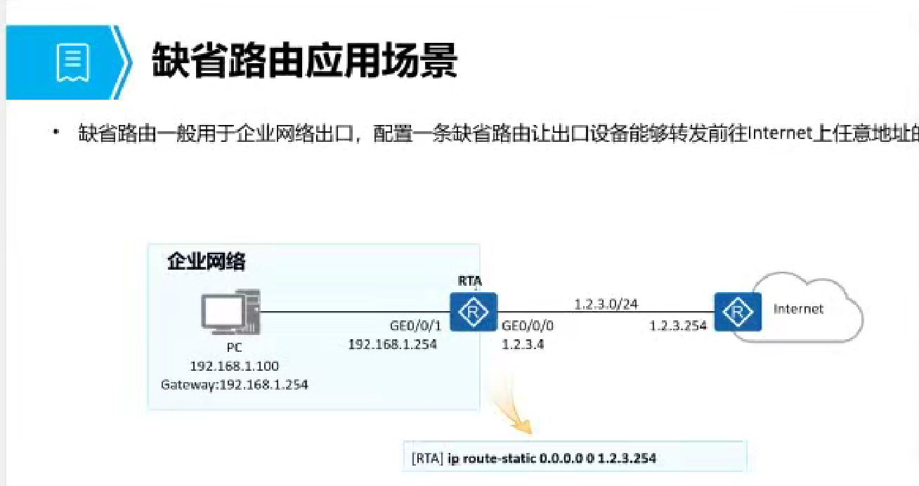 缺省路由也叫默认路由 ,在路由表中的表现是形式为0.0.0.0/0 用于指导去往未知网络的报文转发