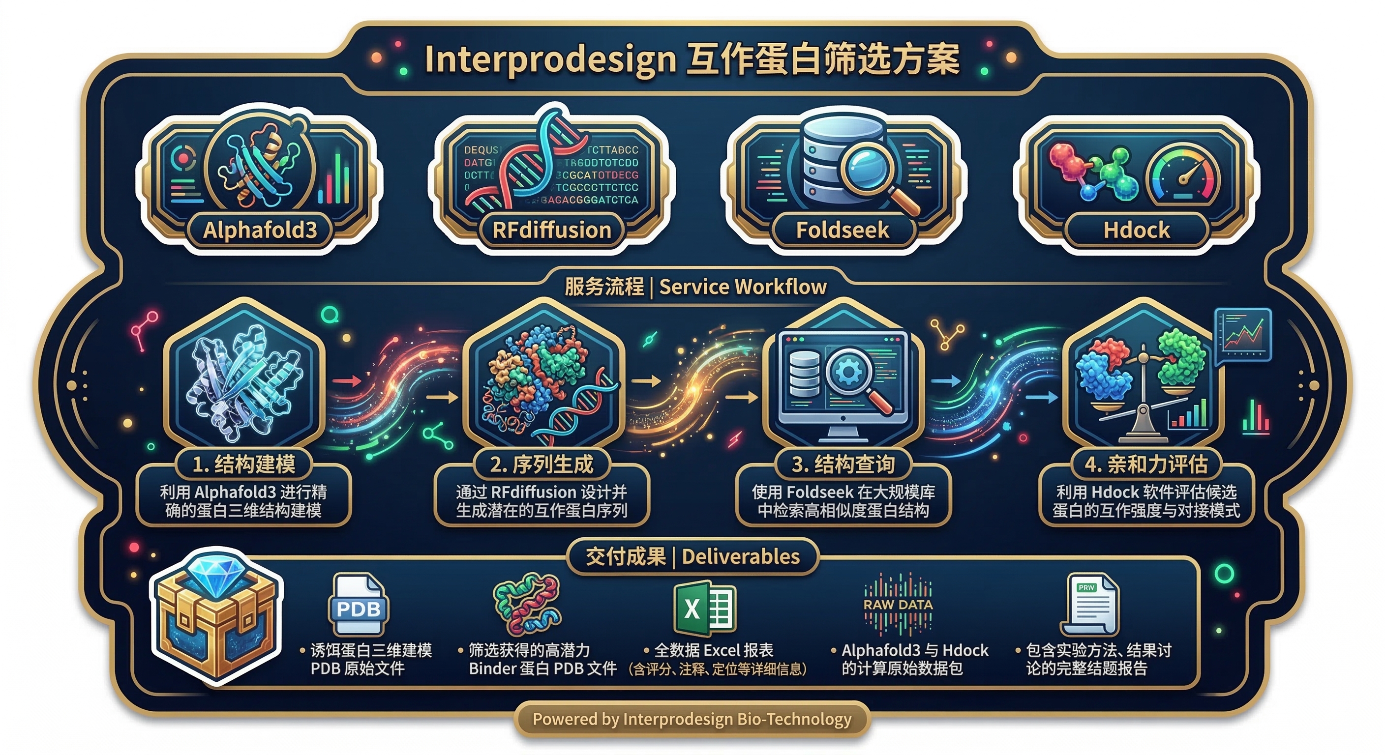- 可视化结果: 直观展示诱饵蛋白与候选蛋白的氢键连接、界面包埋面积及对接构象。