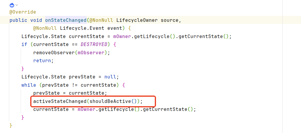 // 3 :第三步出现了新的观察类LifecycleBoundObserver ,可以看到它实现了LifecycleEventObserver ,这个在我们学习Lifecycle的时候有讲过,主要是通过onStateChanged来观察生命周期,可以看下面的代码。