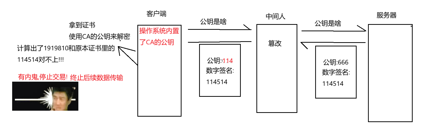 我们知道客户端需要先向服务器申请公钥,然后服务器才能返回.就好比:朕给你的你才能拿~~ 中间人就可以偷偷的把服务器返回的公钥给替换成他自己的公钥,再把伪造的公钥返回给服务器. 这听起来是不是很像古代时的奸臣赵高修改遗嘱,立帝胡亥,赐死扶苏的骚操作呢~~ 不过中间人这个角色在客户端和服务器看来是透明的,不知有其人