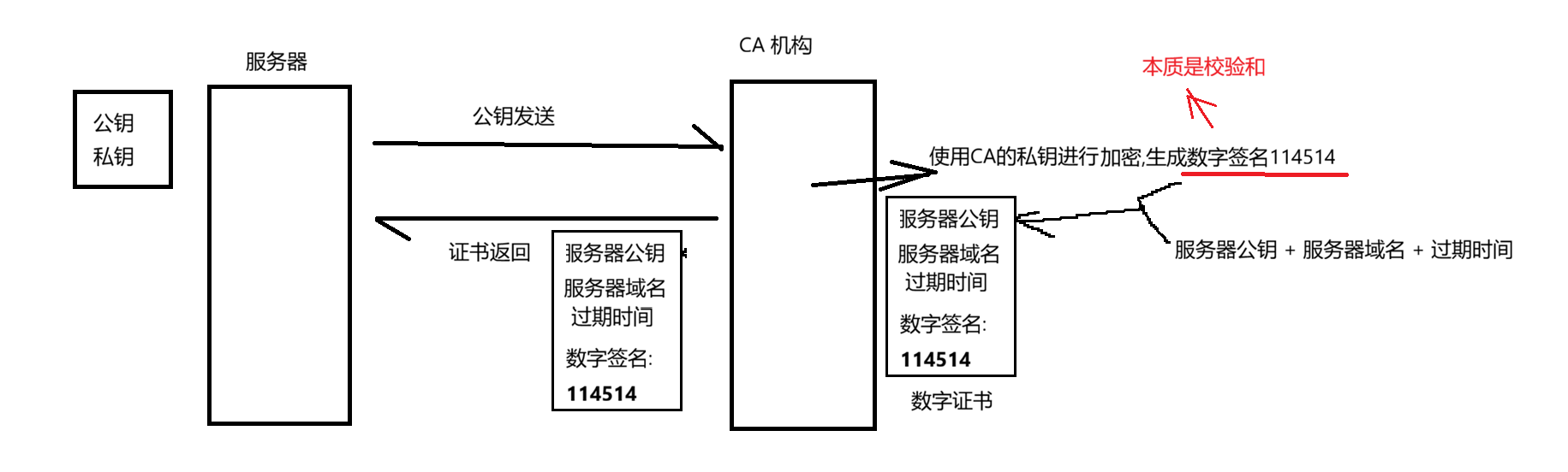 内容: 证书里包含了服务器的公钥、服务器的域名、过期时间,以及 CA 的数字签名(本质是校验和)。