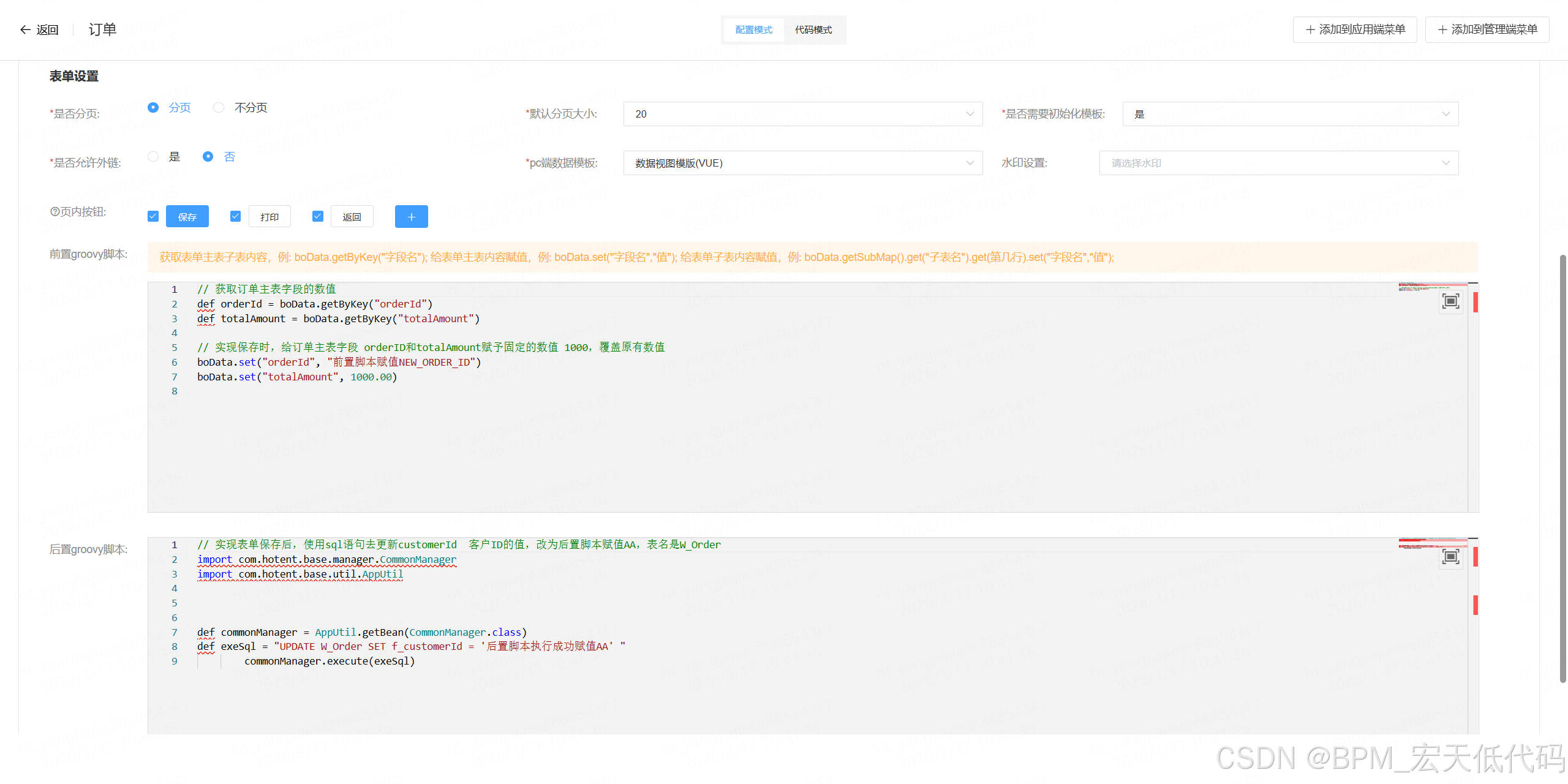 宏天 EIP8 低代码平台中,Groovy 动态脚本是提升表单灵活性、减少硬编码的核心能力。尤其在表单保存场景中,通过前置 / 后置 Groovy 脚本实现字段自动赋值,是新手最常用、最易上手的实战场景。本文以「订单数值字段赋值」为例,手把手教你配置前置 / 后置脚本,全程示例简单易懂,零基础也能学会。
