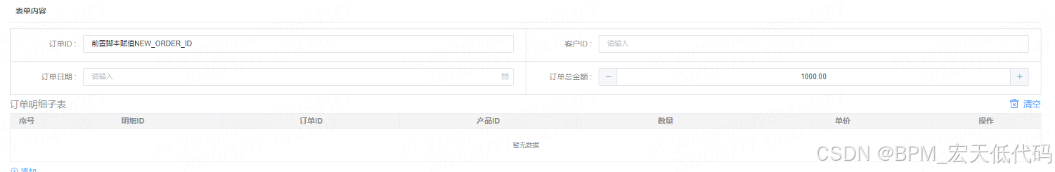 - 保存表单设计,回到表单填报页面,随意填写基础信息(不填 orderId、totalAmount)。