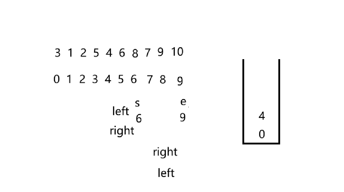 前面的步骤省略,当left与right相遇的时候,依次将0 、4 、6、9入栈,因为栈的性质,以及入栈的顺序,弹出的时候从右往左