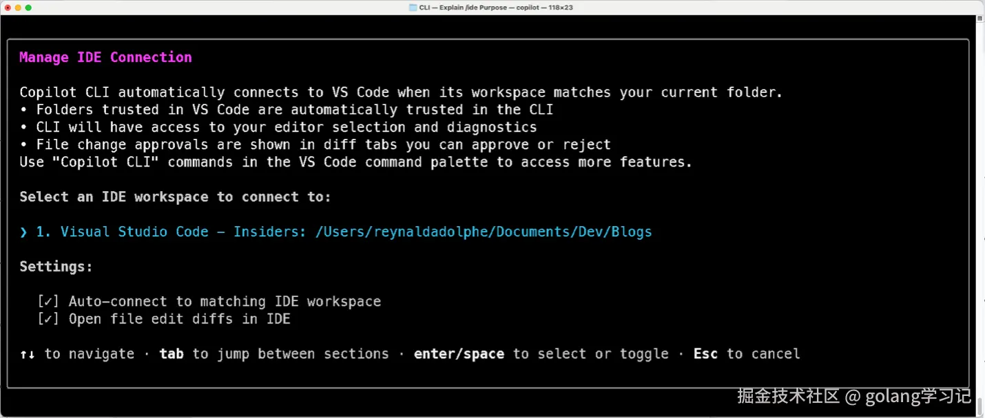 管理连接 :在 CLI 里运行 /ide 即可配置同步策略。