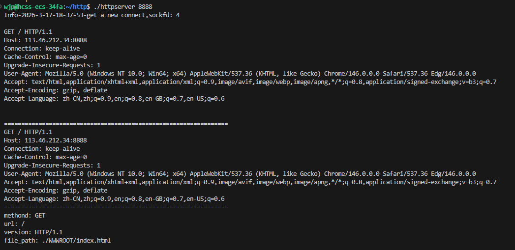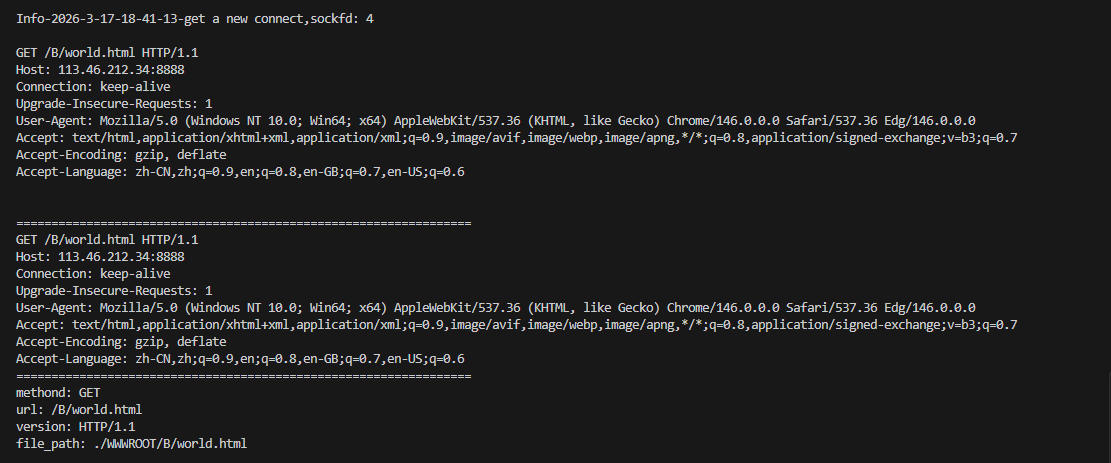 我们的服务器根目录叫 WWWROOT,所以所有访问都要基于这个目录。先把 file_path 初始化为根目录,如果只有一个/或者访问的是index/html就说明访问是WWWROOT目录下的index.html文件。