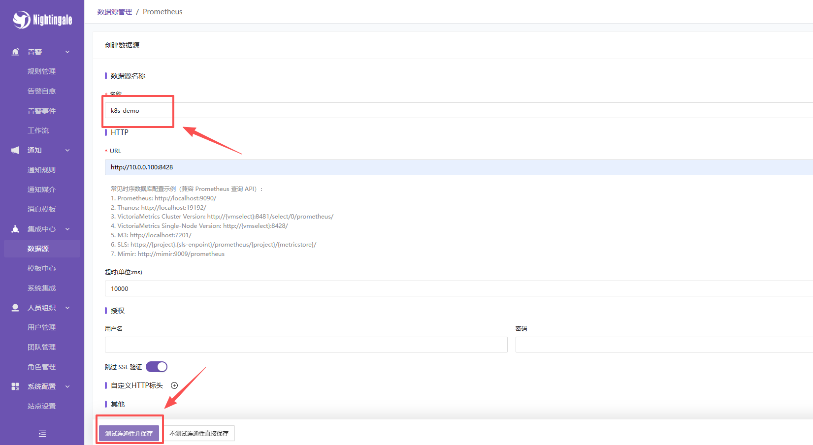 注:全量启动后,夜莺自带了一个内置的 Prometheus,您需要进入夜莺界面,将数据源修改为我们刚才部署的 VictoriaMetrics ( http://<IP>:8428*)。*