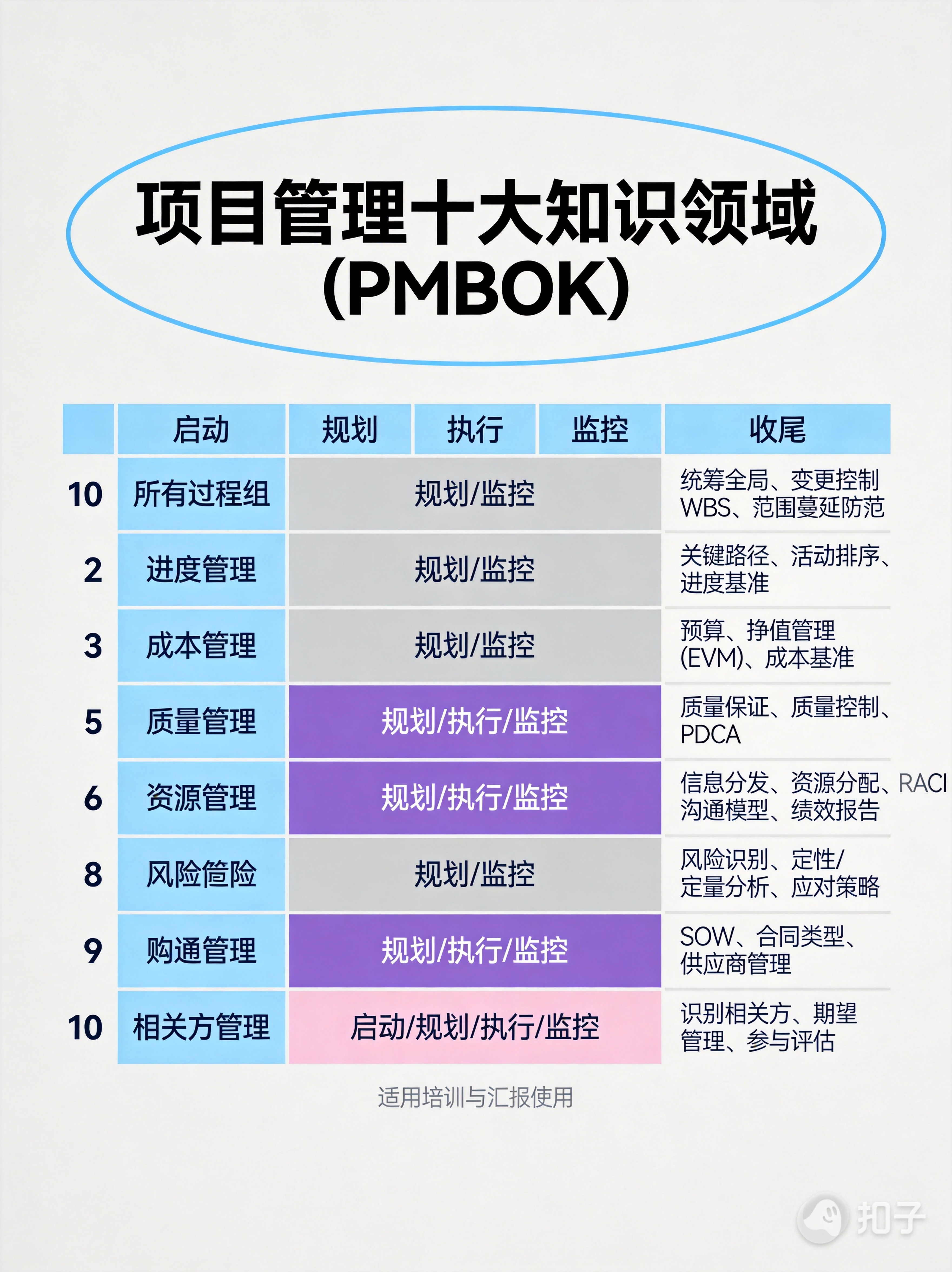 - 核心任务:制定项目章程、协调跨部门资源、管理变更。
