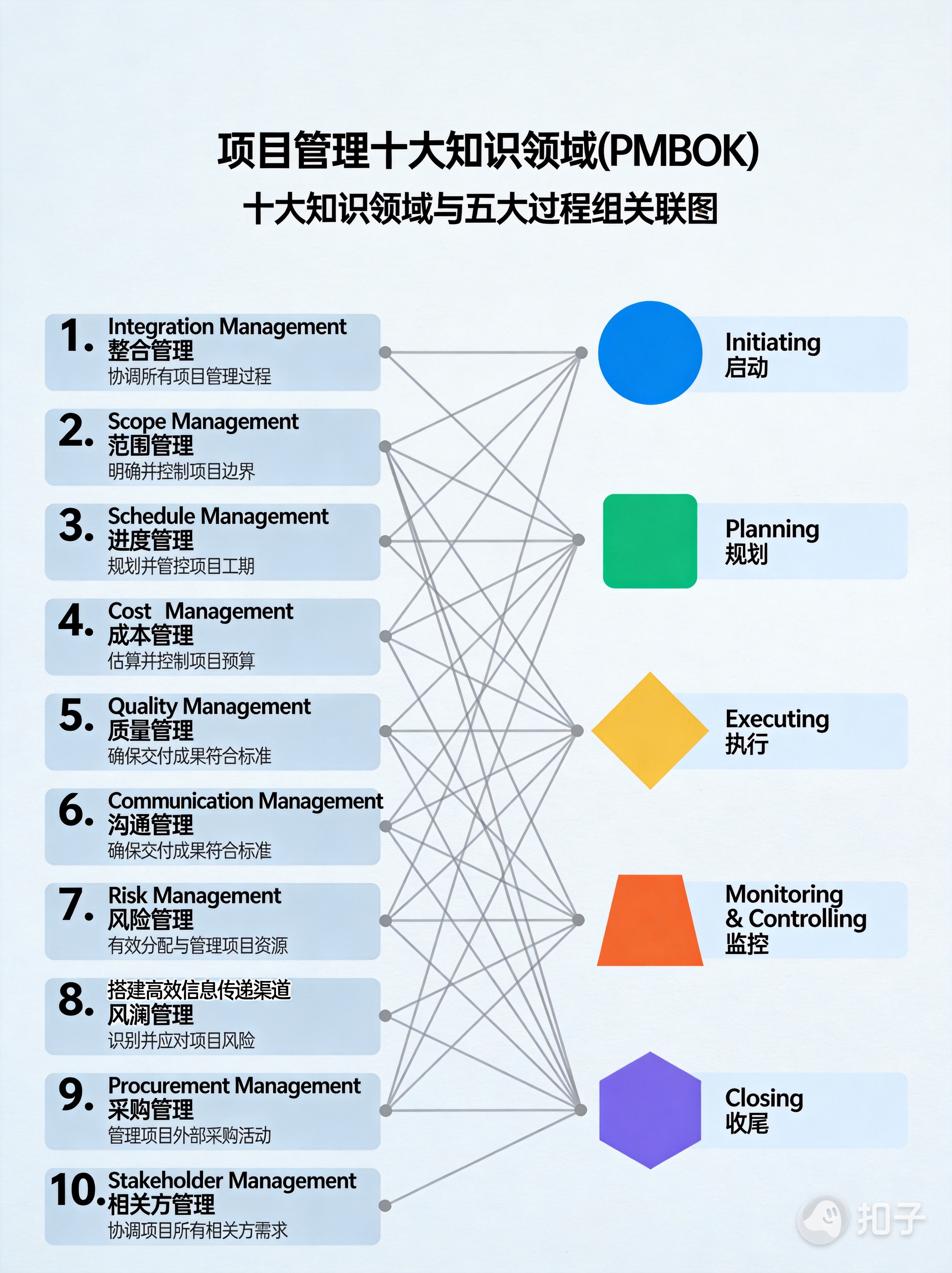 - 输出:是过程的"结果",包括可交付成果、项目管理计划更新、变更请求等,作为下一个过程的输入。