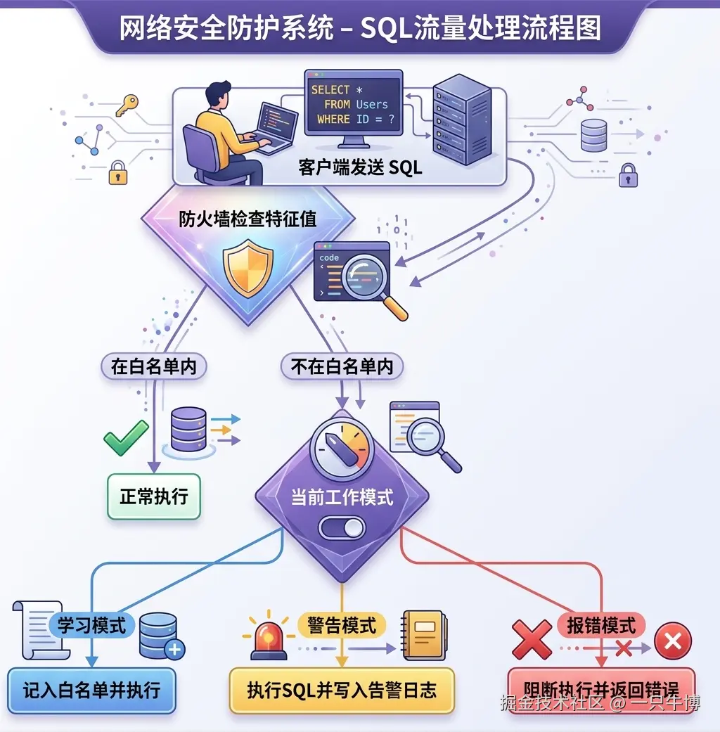 | 学习模式 | 自动将执行的 SQL 记录为白名单规则 | 初次部署,采集合法业务 SQL |