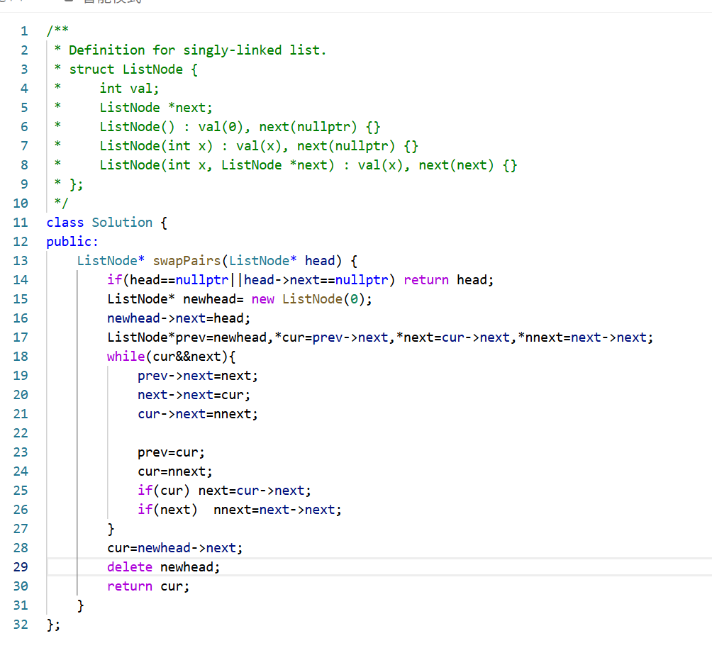 ListNode*prev=newhead,*cur=prev->next,*next=cur->next,*nnext=next->next;