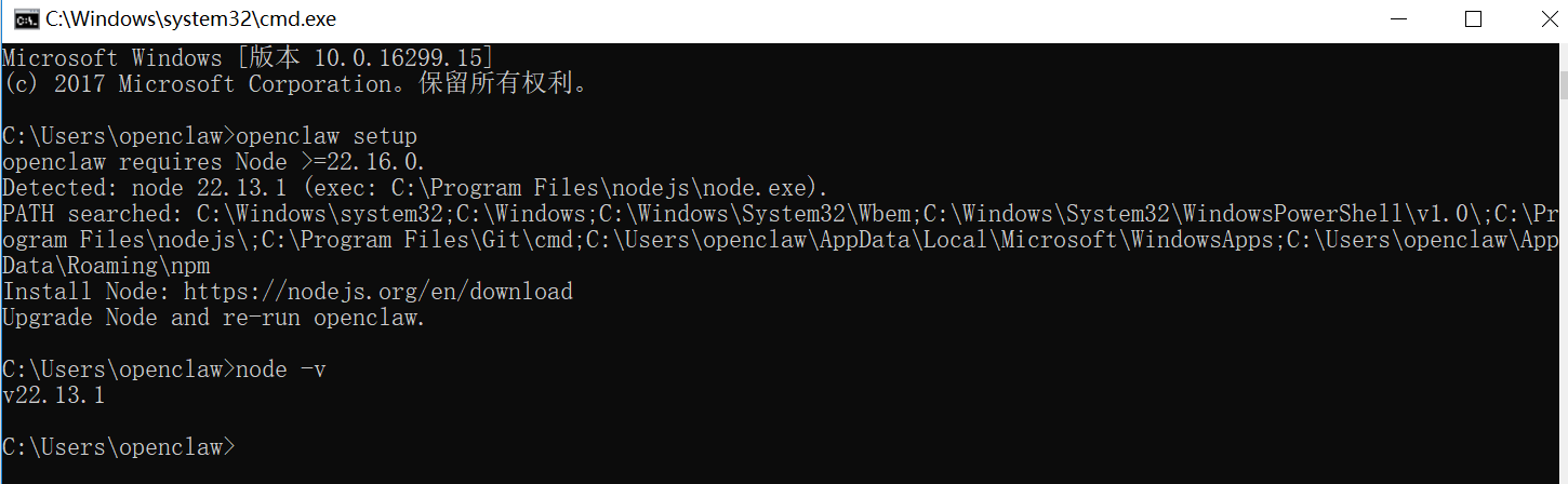 - 输入openclaw setup,输出显示要求node.js的版本大于22.16,我安装好的版本是22.13