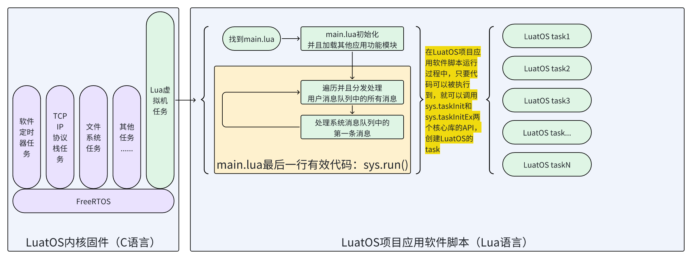 1.4、sys.run():LuatOS调度器,负责整个LuatOS应用脚本程序的调度和管理,主要功能包括: