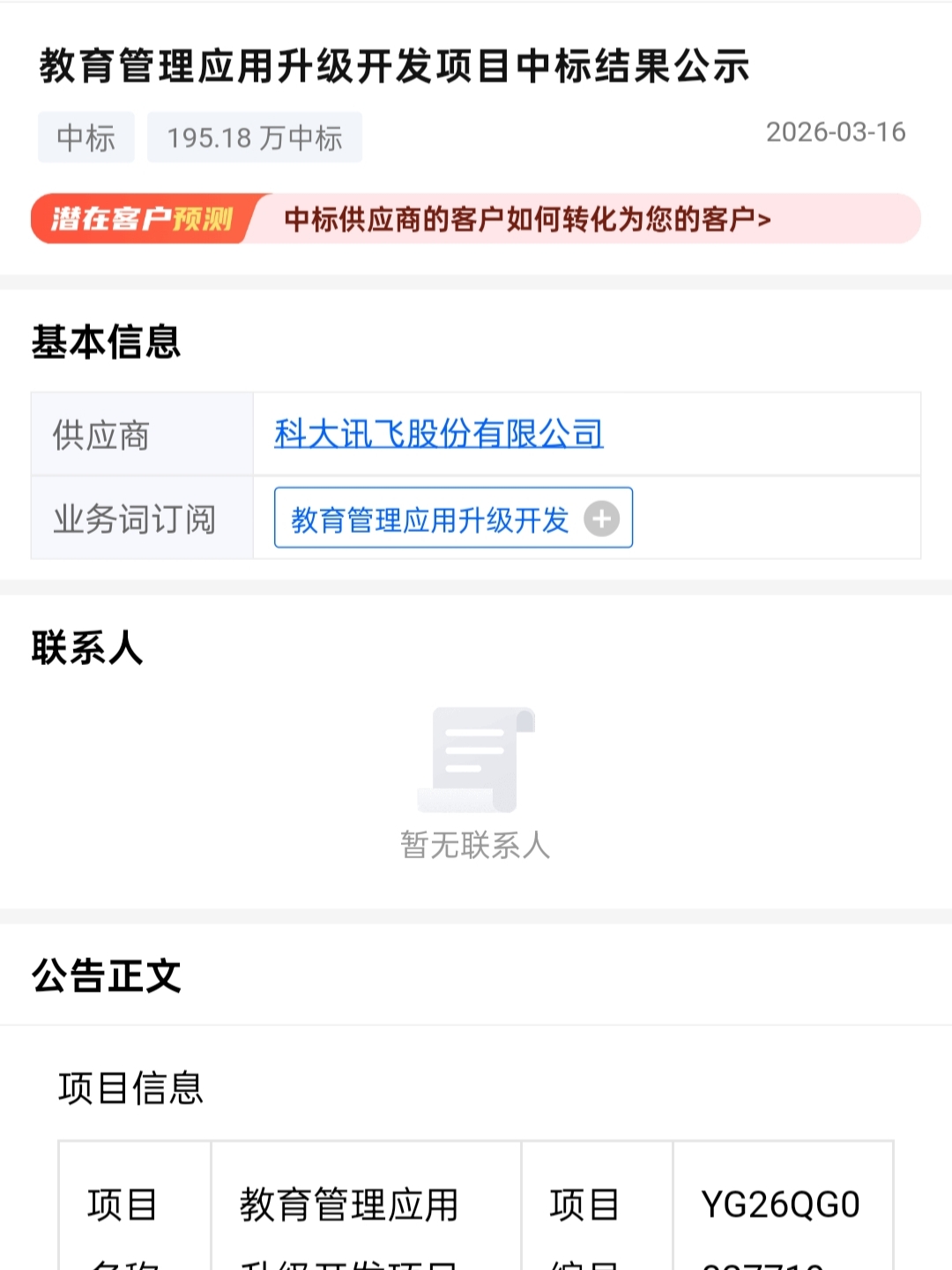 2026年3月16日,教育管理应用升级开发项目发布中标结果公示。该项目中标金额为195.18万元,由科大讯飞股份有限公司中标。
