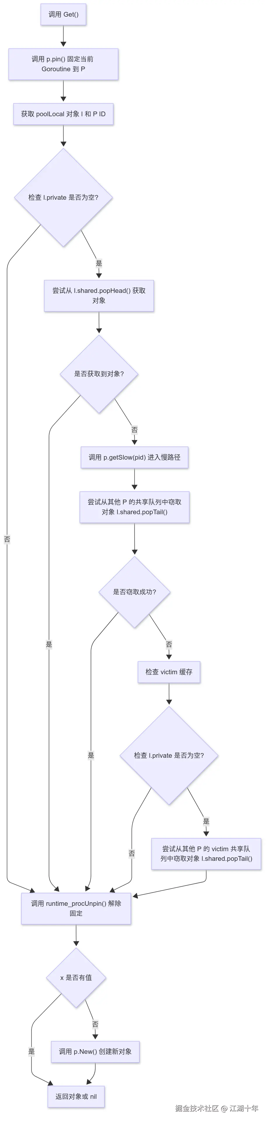 我们可以通过几张流程图,再来梳理一下 sync.Pool 的执行流,以此来加深对 sync.Pool 源码的理解。