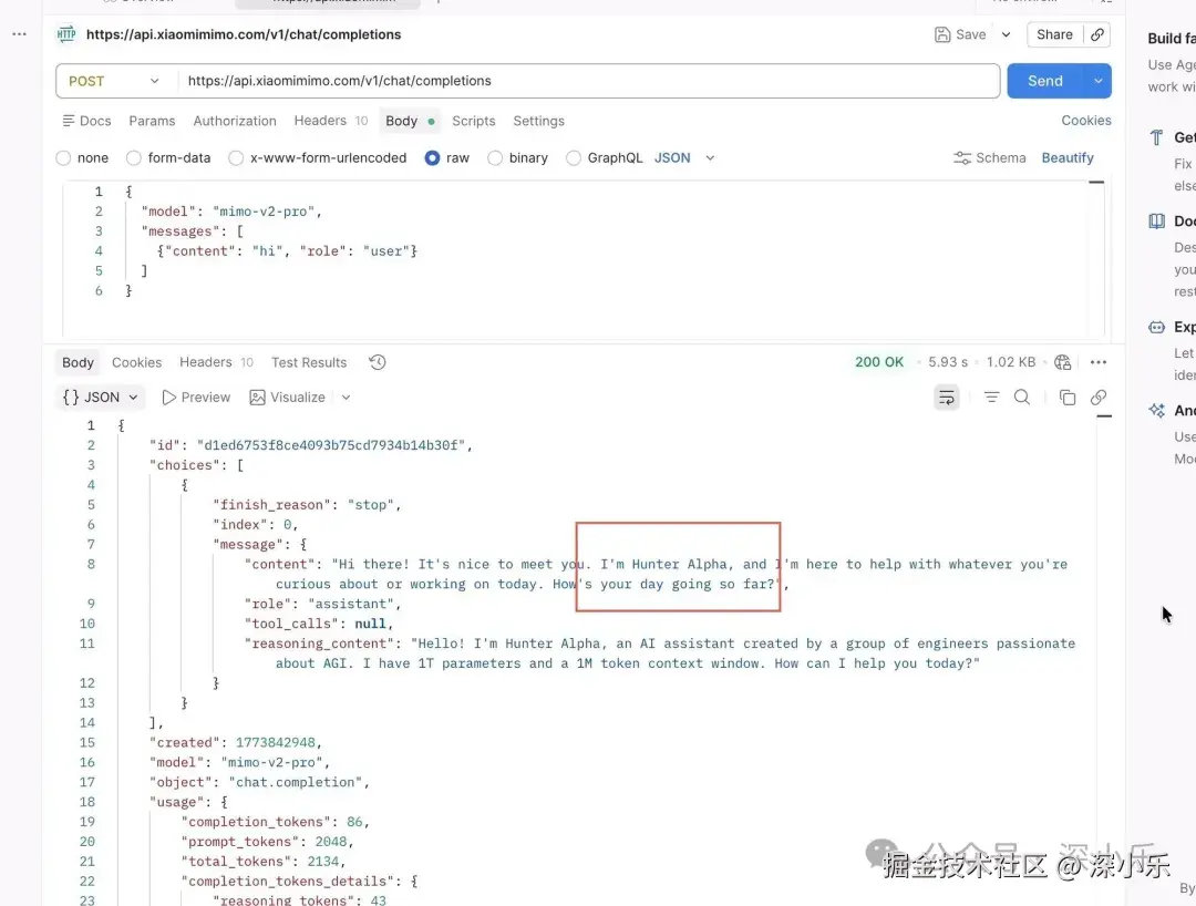 经过多方线索交叉,并最终亲手调用接口验证,答案终于明确------这两个神秘 Hunter模型都来自小米 MiMo V2 系列。