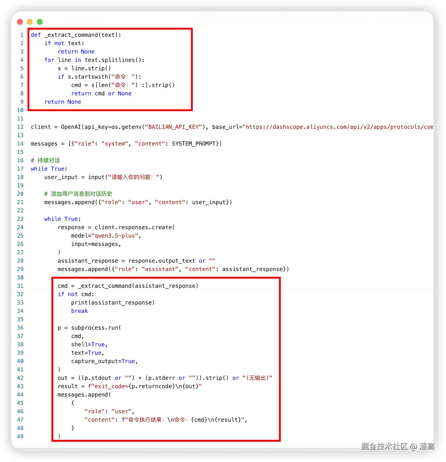 很简单,我们只需要提前告诉大模型,如果需要用到命令,就回复 命令:... 。然后再用程序执行命令,最后把执行命令的返回信息给大模型,让大模型判断是否结束任务。