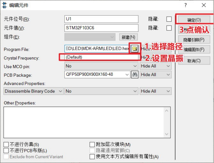 在Proteus中,双击STM32F103C6芯片,打开"编辑元件"窗口。