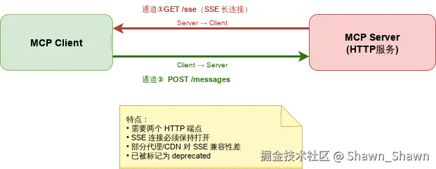 SSE (Server-Sent Events) 传输基于 HTTP,使用 两个通道 实现双向通信: