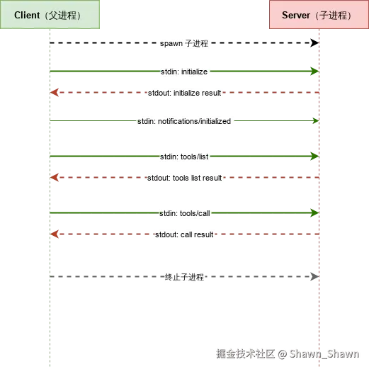 Stdio(标准输入输出)传输是最简单的传输方式。MCP Client 将Server 作为 子进程 启动,通过进程的 stdin 和 stdout 进行双向通信。