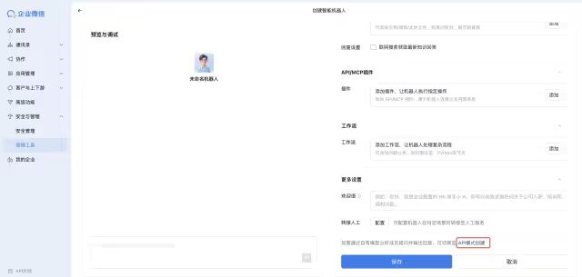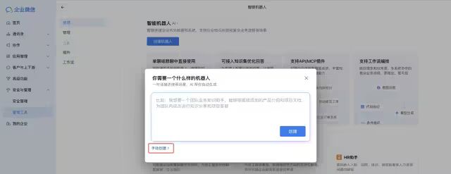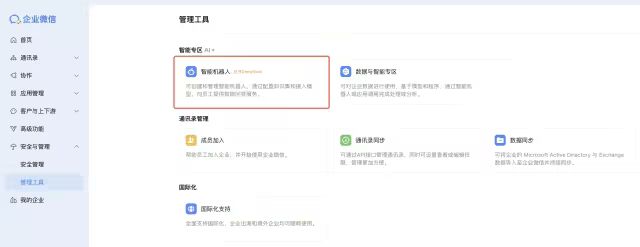 登录企业微信管理后台,在管理工具页面中,创建智能机器人: