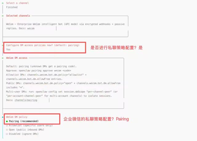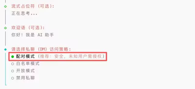 在企业微信的网关通道属性配置页面中,设置对话的模式为安全配对模式: