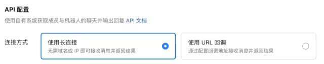 在API模式创建页面中,连接方式使用长连接,长连接模式是全双工通讯的网络通道,是消息交互的常用模式: