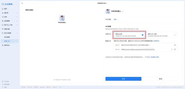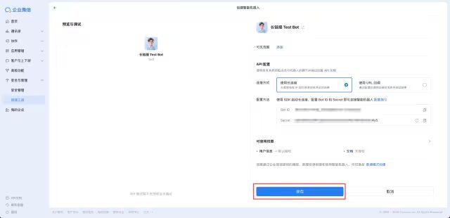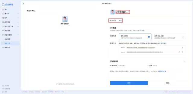 在创建智能机器人属性配置页面中,确定保存,即可完成企业微信AI助手的搭建: