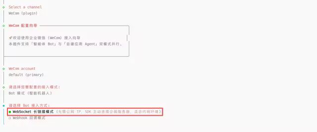 在企业微信的网关通道属性配置页面中,设置Bot 模式(智能机器人)的接入模式为WebSocket 长连接模式: