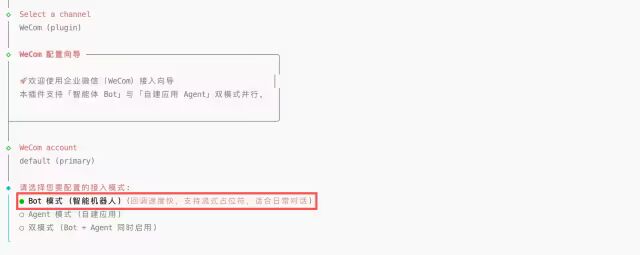 在企业微信的网关通道属性配置页面中,设置接入模式为企业微信管理后台中创建的Bot 模式(智能机器人):