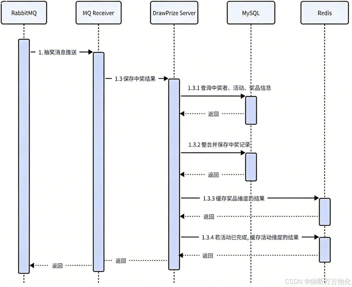 - 抽奖请求处理:前端随机选择参与者,管理员发起抽奖请求,包含活动ID、奖品ID、中奖人员名单。请求经校验后发送至RabbitMQ消息队列,等待MQ消费者真正处理抽奖逻辑,抽奖请求处理接口不再完成任何事情,直接返回,实现异步处理。