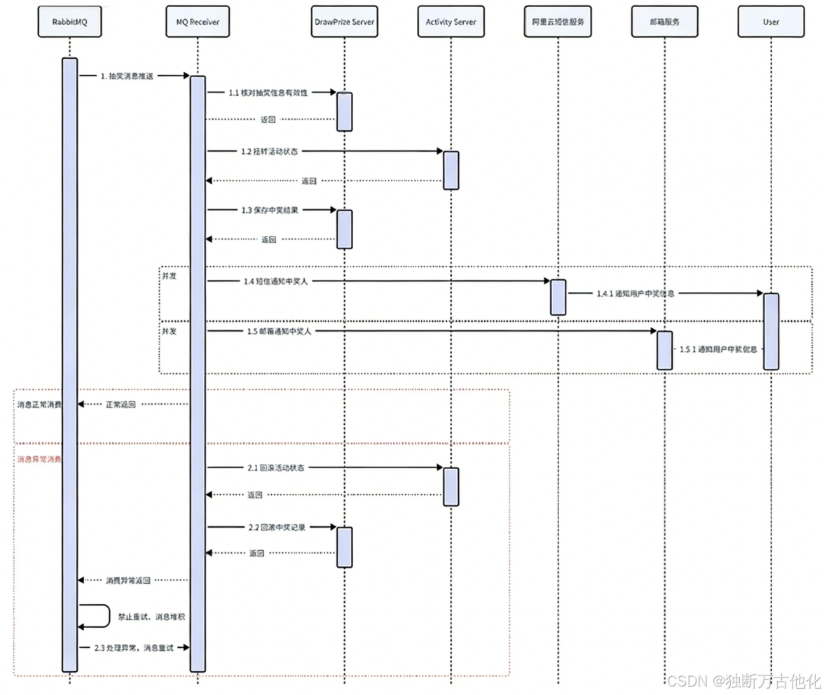 - 异常处理:若抽奖过程发生异常,通过事务回滚保证数据一致性,并利用死信队列对失败消息进行重试或记录。