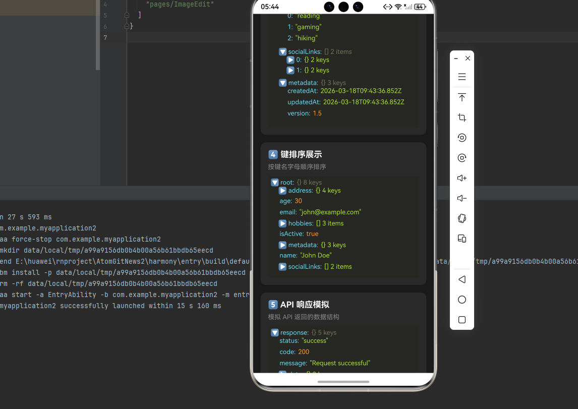 通过集成 react-native-json-tree,我们为项目添加了强大的 JSON 数据可视化能力。该库提供了丰富的主题定制选项和灵活的渲染控制,特别适合开发调试工具、API 监控面板、配置管理界面等场景。