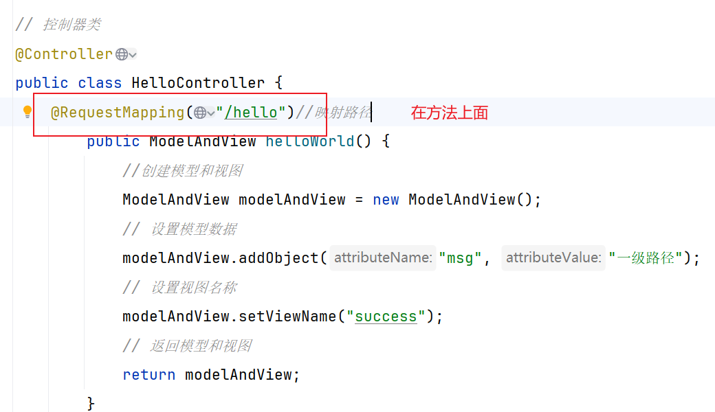 * 底层:HandlerMapping(处理器映射器)会扫描该注解,建立 "/hello" 与 helloWorld() 方法的映射关系