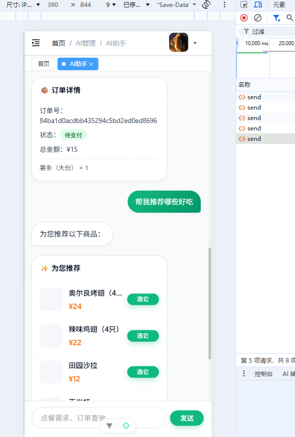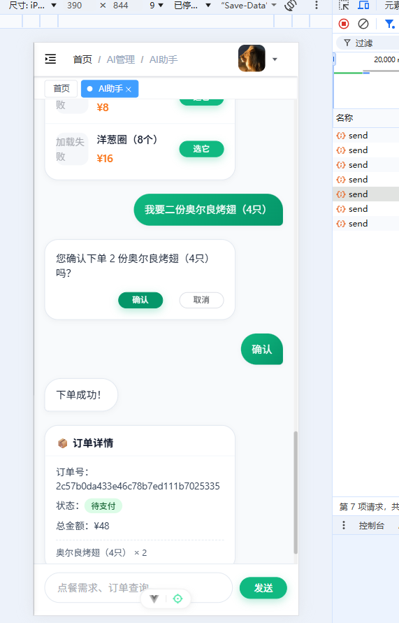 action和params,前端点击确认后自动发送"确认"消息,触发confirmOrder调用。 -